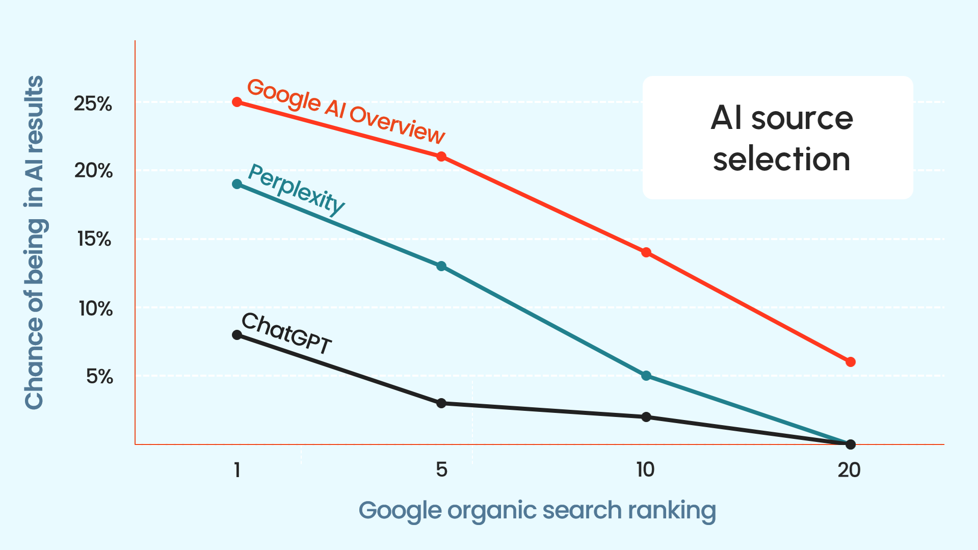 In other words, strong performance in search rankings offers limited influence over whether an LLM will use your content. This is because LLMs don't index and rank information in the same way as traditional search engines. They selectively pull content, assess smaller sections of information, and build answers using material from multiple sources.